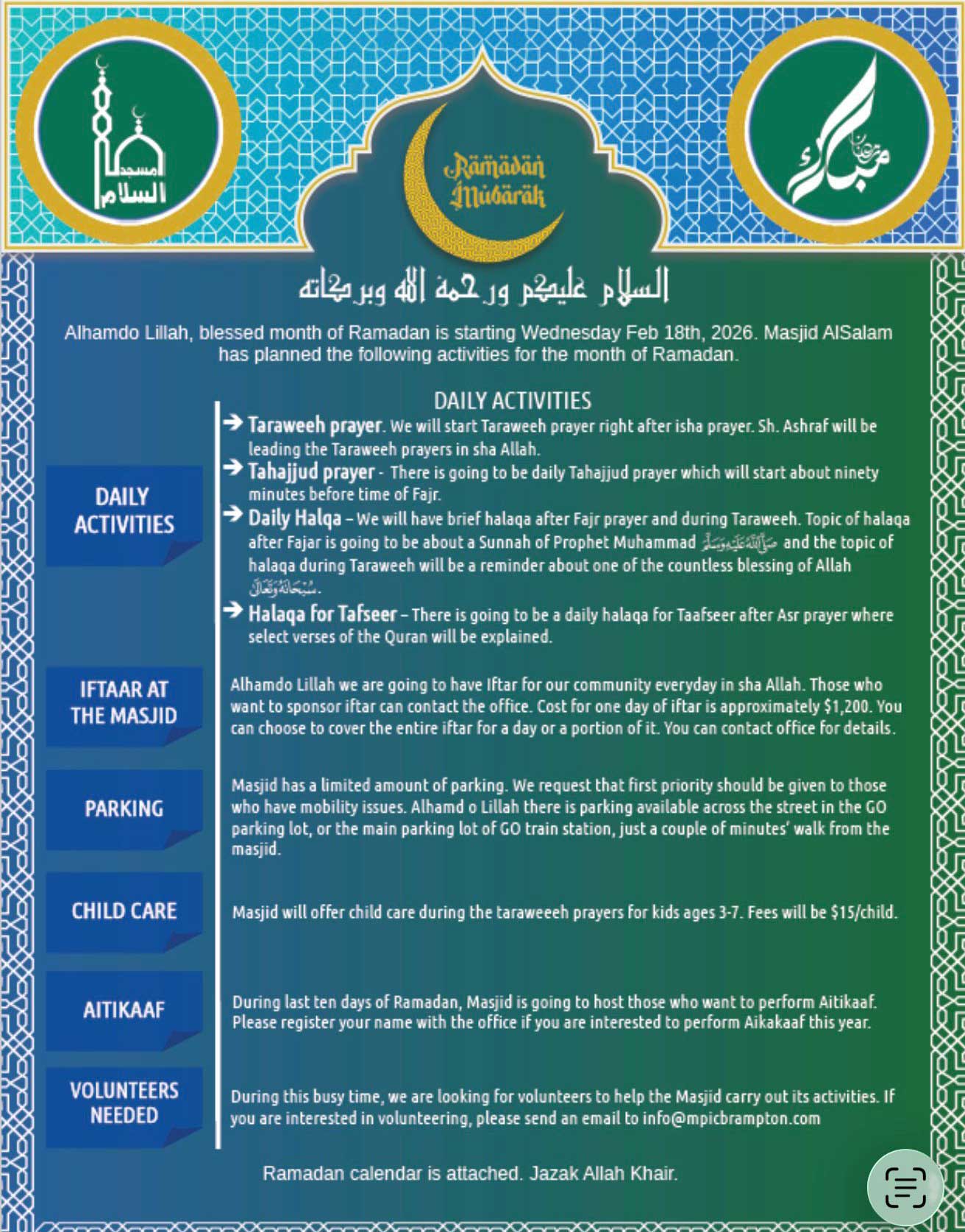 Masjid AlSalam has prepared a full schedule of spiritual programs and community activities to help us all benefit from this sacred time.